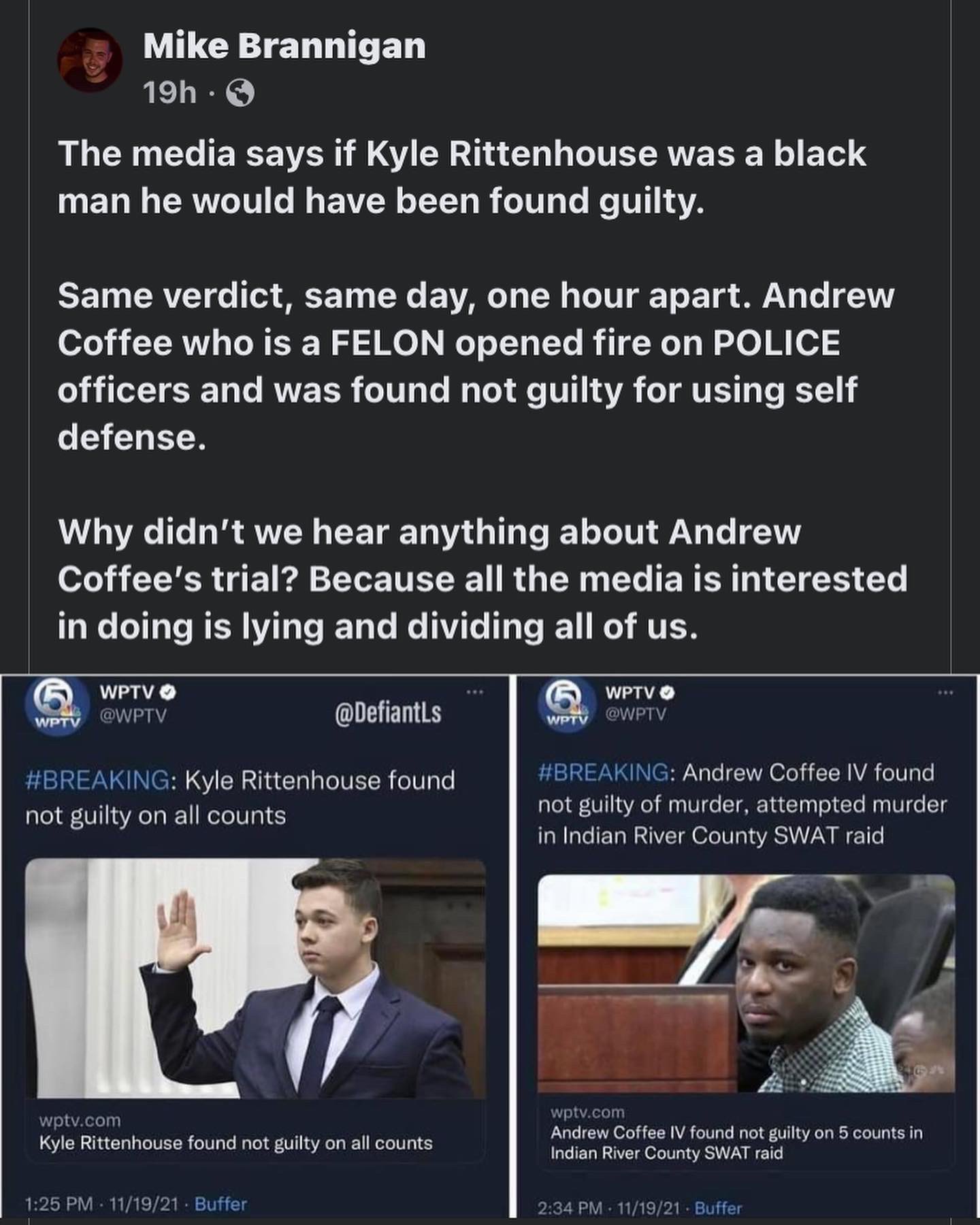 I agree with the Kyle Rittenhouse verdict and I agree with the Andrew Coffee IV verdict. Sandy Malone November 23 2021. Andrew Coffee IV found not guilty on all counts of murder attempted first degree murder.